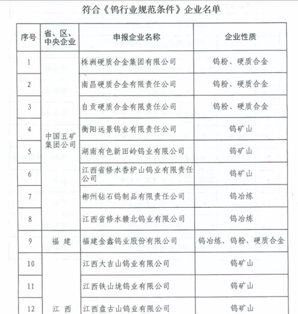 經(jīng)企業(yè)申報、省級工業(yè)和信息化部主管部門核實、專家復(fù)核、現(xiàn)場核查及網(wǎng)上公示,一批鎢企業(yè)符合規(guī)范條件,詳情見圖。